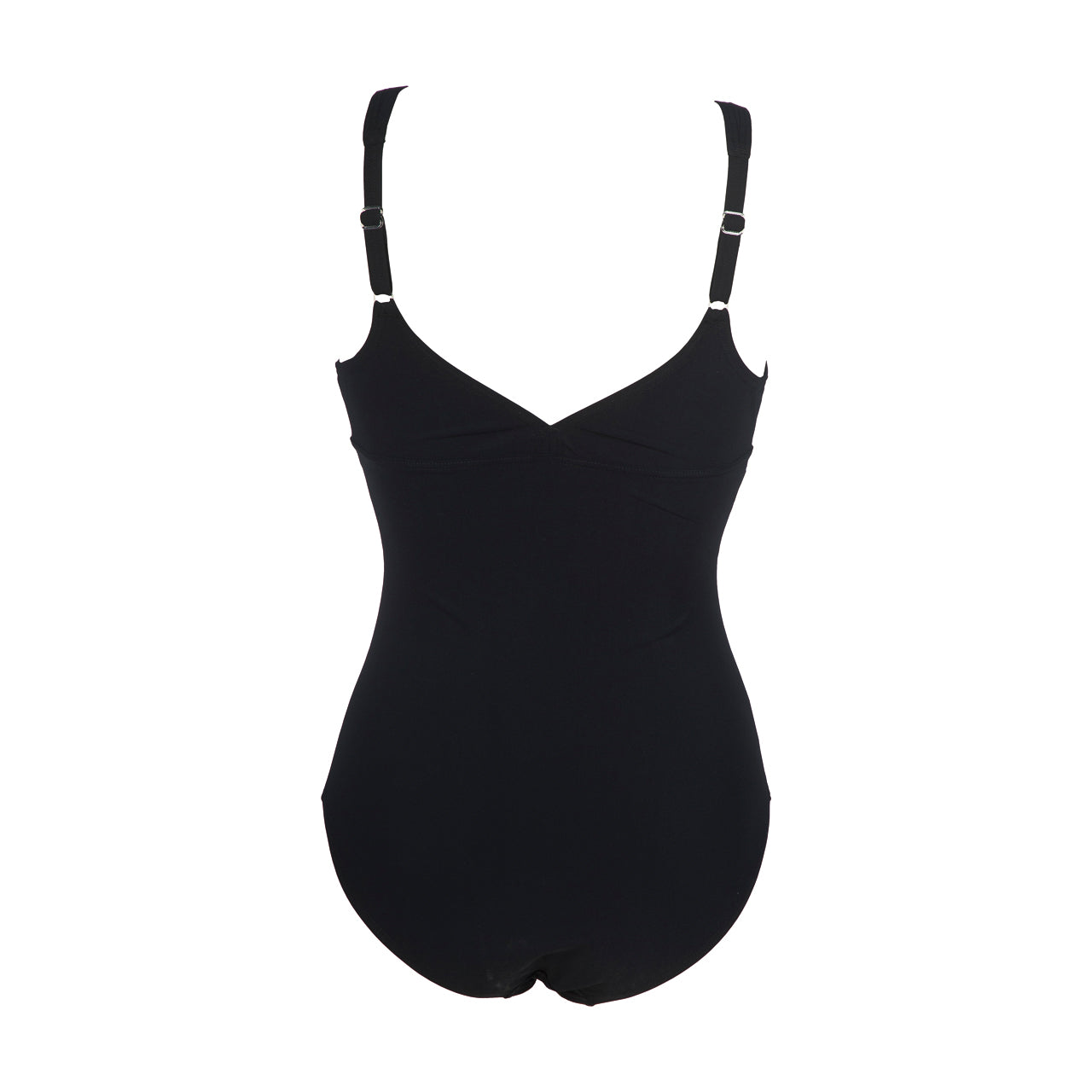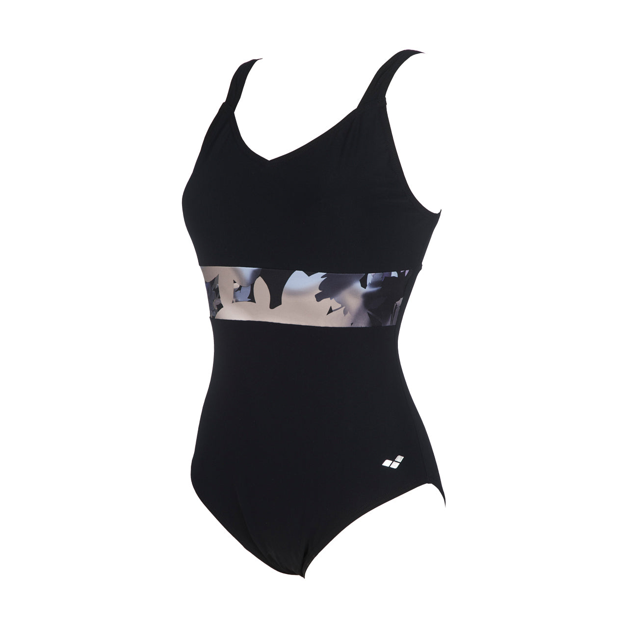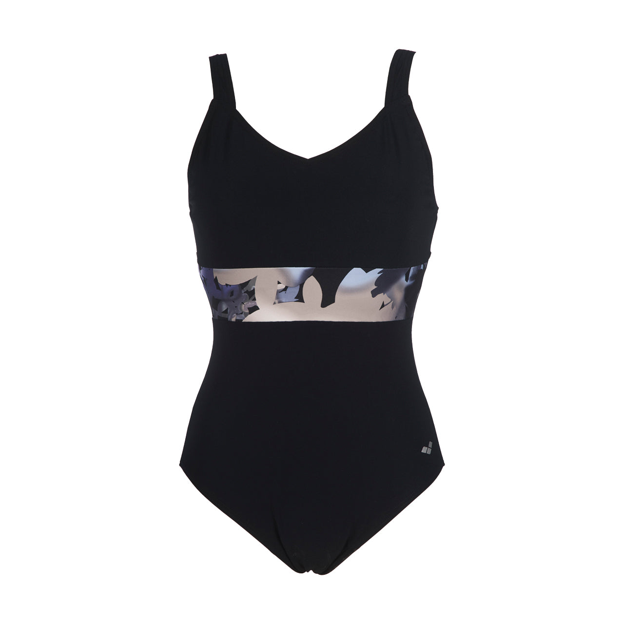 Flot one piece badedragt med åben ryg (U-back) Sort med abstrakt motiv i flotte lilla nuancer på badedragtens front fra taljen op opefter. Stropperne kan indstilles, så du opnår perfekt pasform.