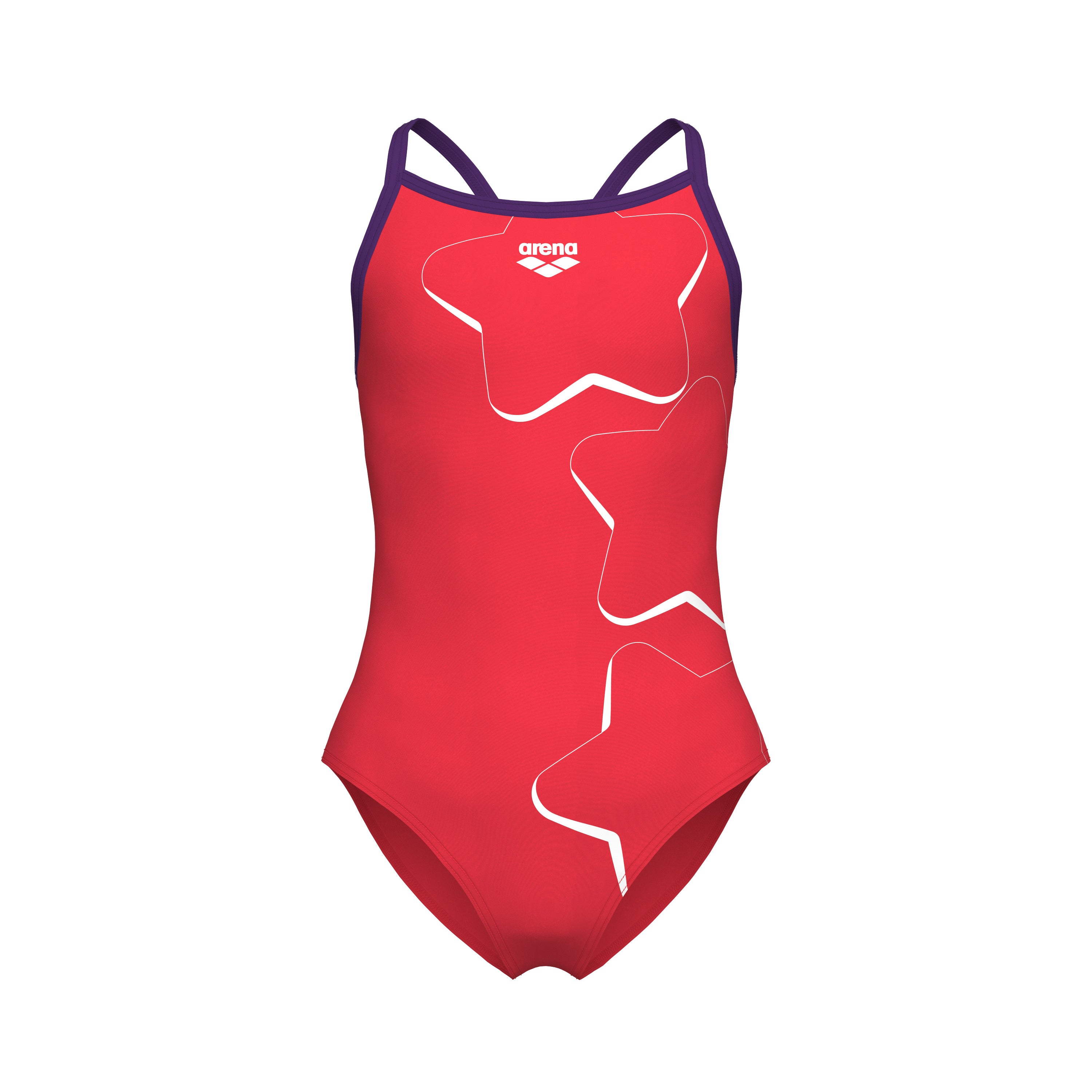 GIRL'S ARENA STAR GRAPHIC SWIMSUIT LIGHTDROP BACK BRIGHT CORAL-PLUM er en farverig og sporty badedragt designet til unge svømmere. Den har en Lightdrop Back-ryg, der giver stor bevægelsesfrihed og en behagelig pasform.