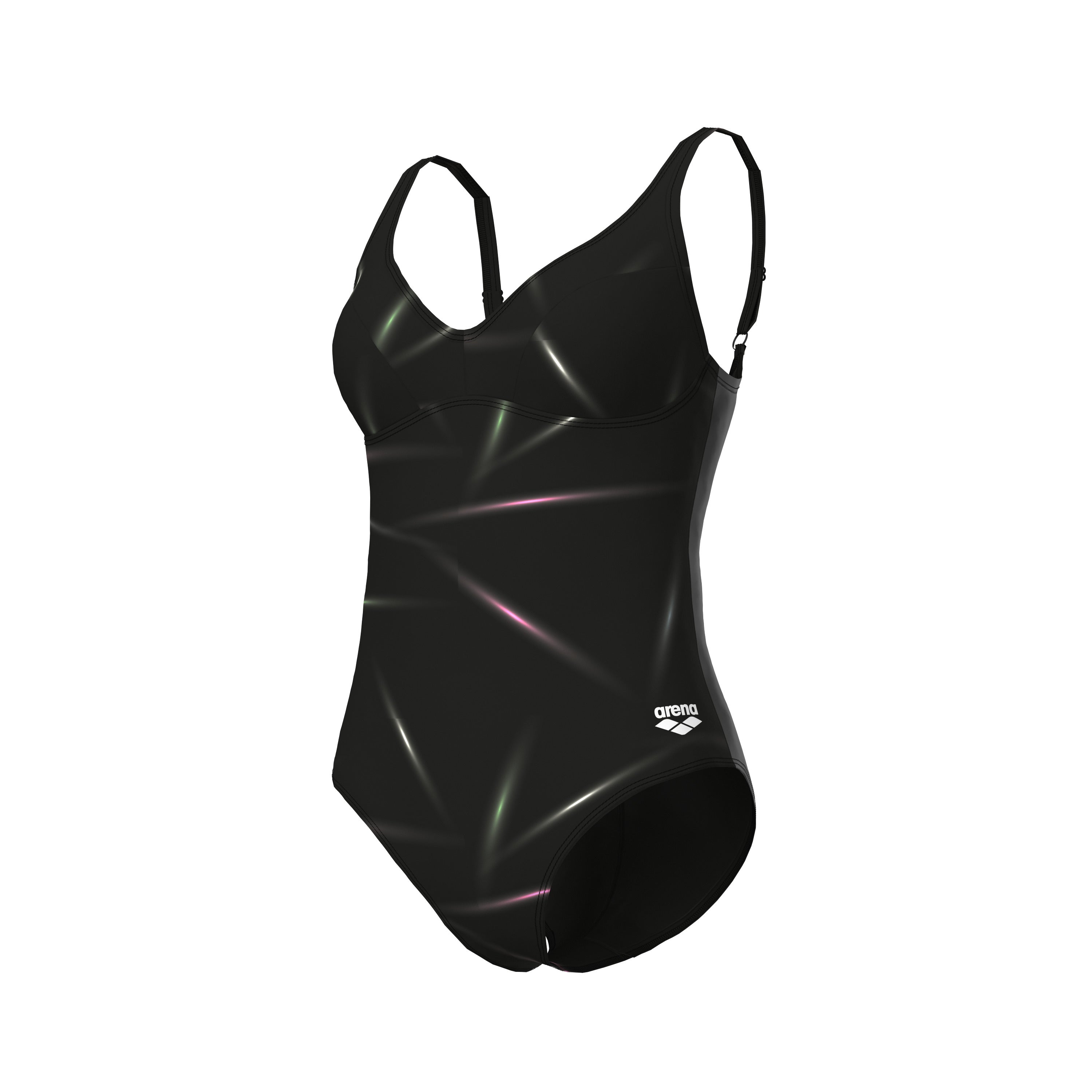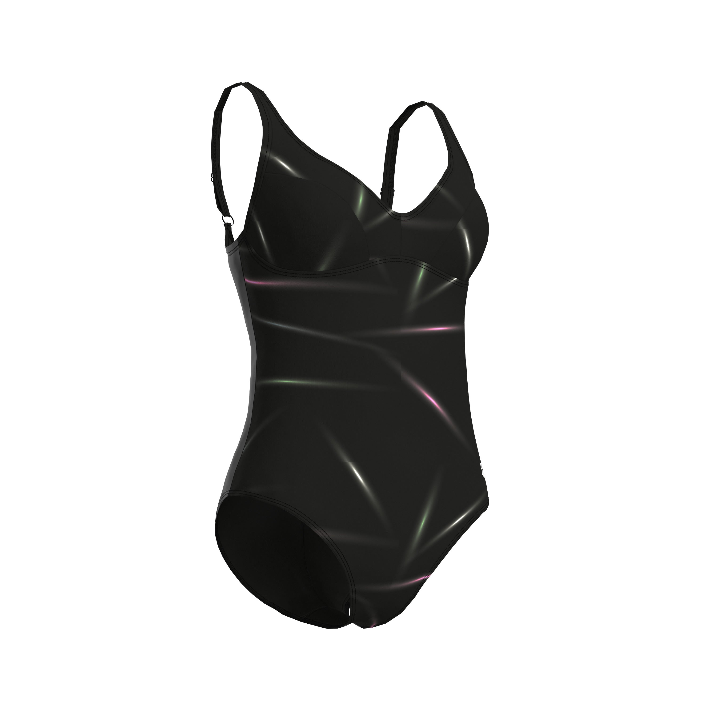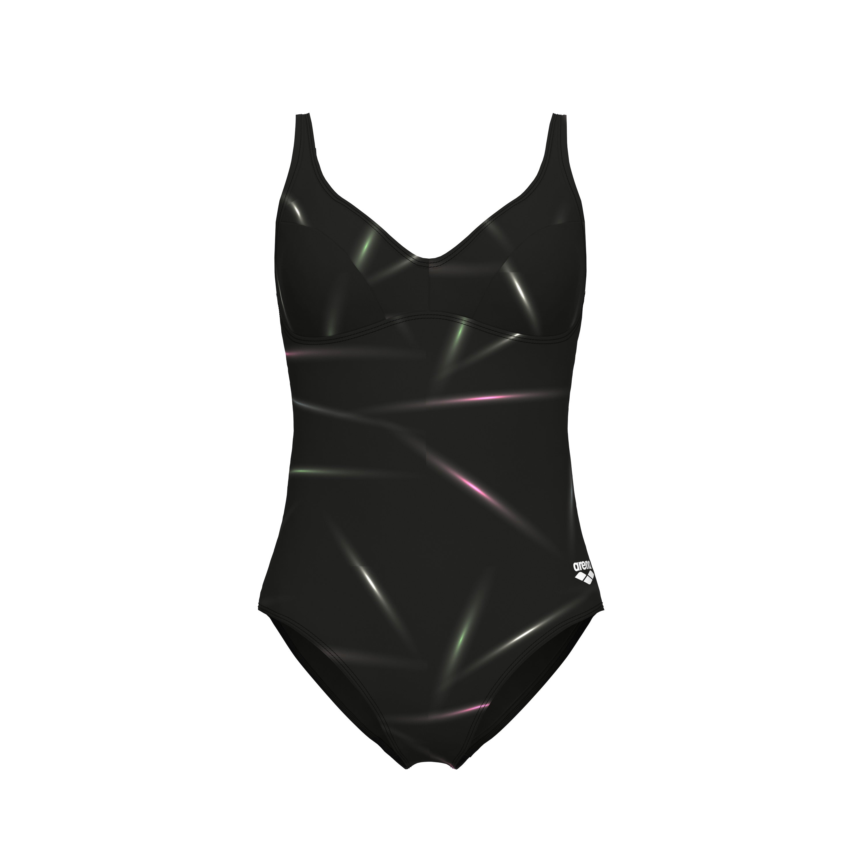 Arena Stars Rain Swimsuit kombinerer performance med et feminint udtryk. Badedragten har et mørkt kosmisk design med stjerneskud, en flot V-udskæring og justerbare stropper, så du kan tilpasse pasformen præcist. Perfekt til svømmere, der ønsker både stil og funktionalitet under intensive træningspas.